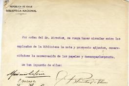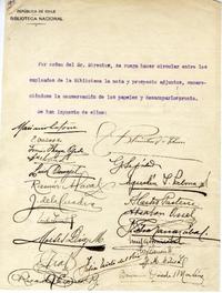 Circular interna de la Biblioteca Nacional solicitando la conservación y resguardo de los documentos. Firman los siguientes funcionarios notificados: Mariano Latorre, Emilio Vaisse, Thomas Thayer, Ramón A. Laval, Felix Nieto del Río, Emilio Zañartu entre otros.