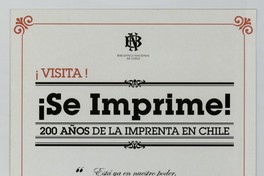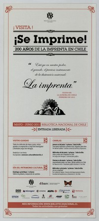 ¡Se imprime! 200 años de la imprenta en chile. [estampa] : [Santiago, Chile] : Biblioteca Nacional de Chile, 2011. 1 cartel (afiche) : color ; 64 x 27,5 cm. .