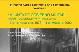 La Junta de Gobierno militar : poder constituyente y legislativo, 11 de septiembre de 1973-11 de marzo de 1990 / recopilación e interpretación de: Brian Loveman y Elizabeth Lira. Santiago de Chile : Ediciones Biblioteca Nacional de Chile, 2021 (Santiago de Chile : Salesianos Impresores S.A.) 531 páginas, 20 páginas sin numerar : ilustraciones, facsímiles ; 23 cm. .