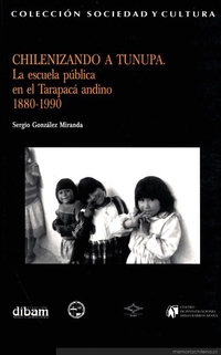Chilenizando a Tunupa : la escuela pública en el Tarapacá andino 1880-1990 / Sergio González Miranda. Santiago de Chile : DIBAM, Centro de Investigaciones Diego Barros Arana : Universidad Arturo Prat : Instituto de Estudios Andinos ISLUGA, 2002 (Santiago : Salesianos) 292 pàginas : ilustraciones ; 23 cm. .