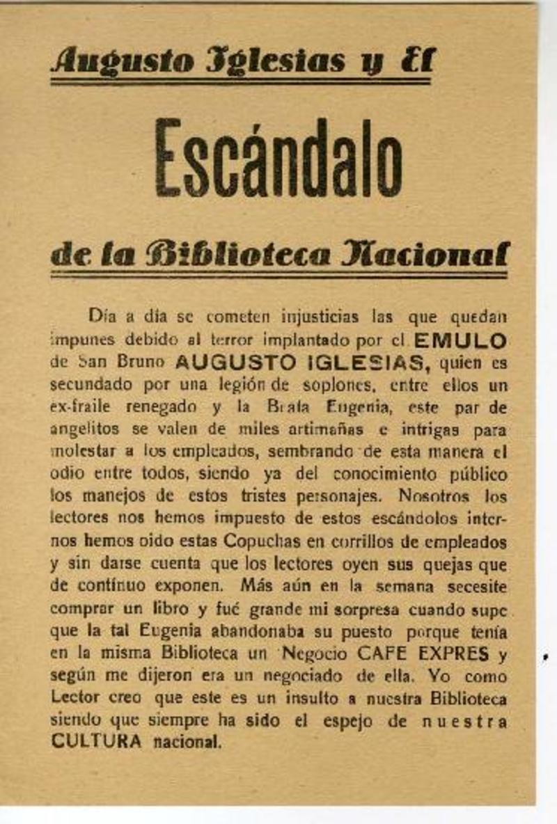 Panfleto (autor anónimo) sobre Augusto Iglesias, nuevo Director de la Biblioteca Nacional de Chile el año 1948.
