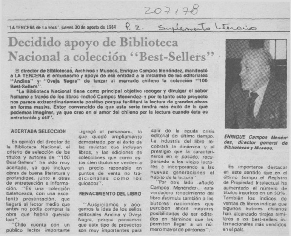 Decidido apoyo de Biblioteca Nacional a colección "best-sellers" [artículo].