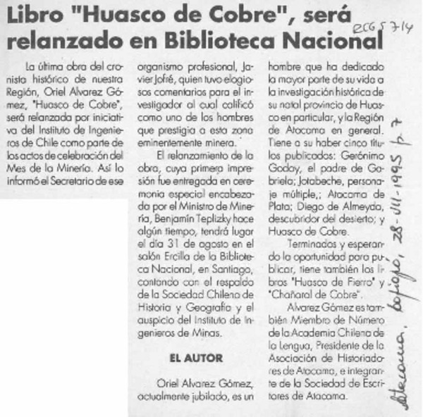 Libro "Huasco de cobre", será relanzado en Biblioteca Nacional [artículo].