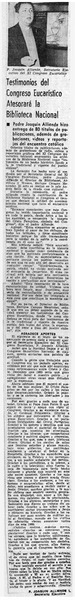 Testimonios del Congreso Eucarístico atesorará la Biblioteca Nacional [artículo] Joquín Alliende.