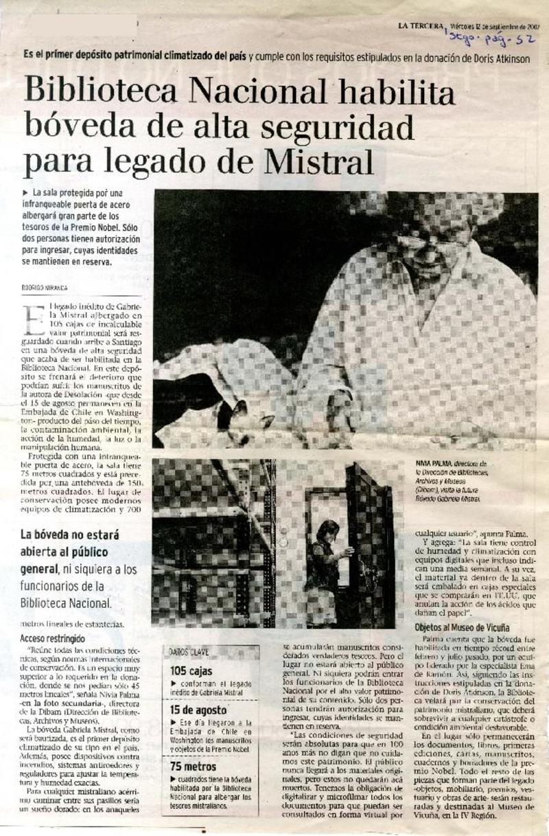 Biblioteca Nacional habilita bóveda de alta seguridad para legado de Mistral [artículo] Rodrigo Miranda.